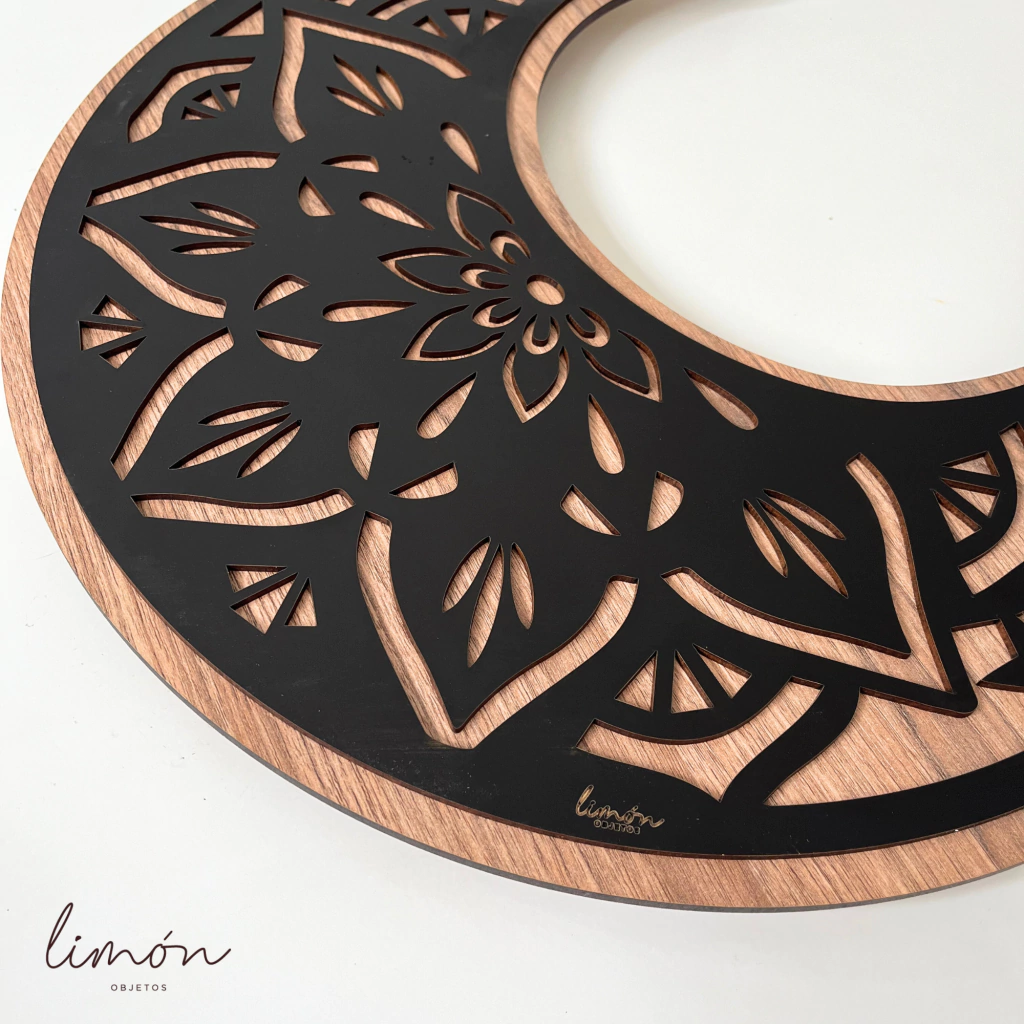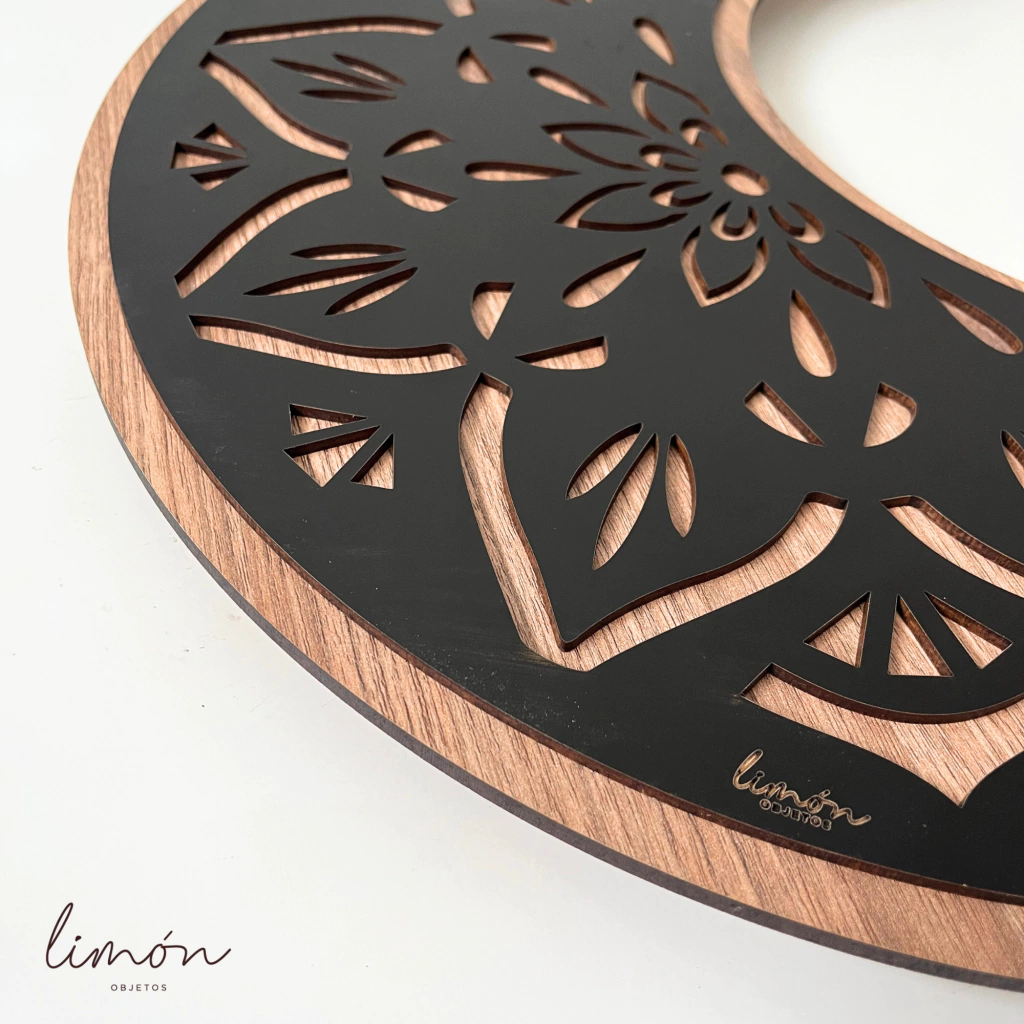 Descubrí el Cuadro en forma de luna, una pieza única que combina arte y naturaleza. Confeccionado en dos capas de madera, este cuadro presenta un fondo en tono de madera natural y una capa frontal en negro satinado. En su interior, se pueden apreciar delicados detalles de mandala, que aportan un aire de serenidad y sofisticación.