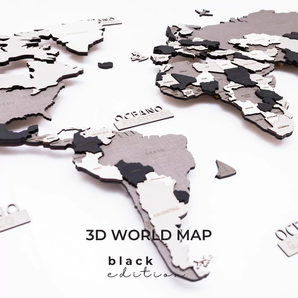 3D World Map Design Black tiene un diseño 100 % innovador realizado en distintas maderas texturadas con nombres grabados en todos los países. Posee un espesor total 1 cm.
