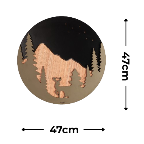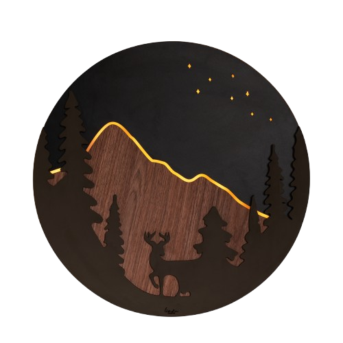 La escena representa un paisaje de montaña con árboles y un ciervo, ideal para los amantes del diseño inspirado en la naturaleza patagónica. La iluminación LED trasera agrega una cálida luz ambiental, destacando el contorno de la montaña y simulando un cielo estrellado, perfecto para generar una atmósfera acogedora.