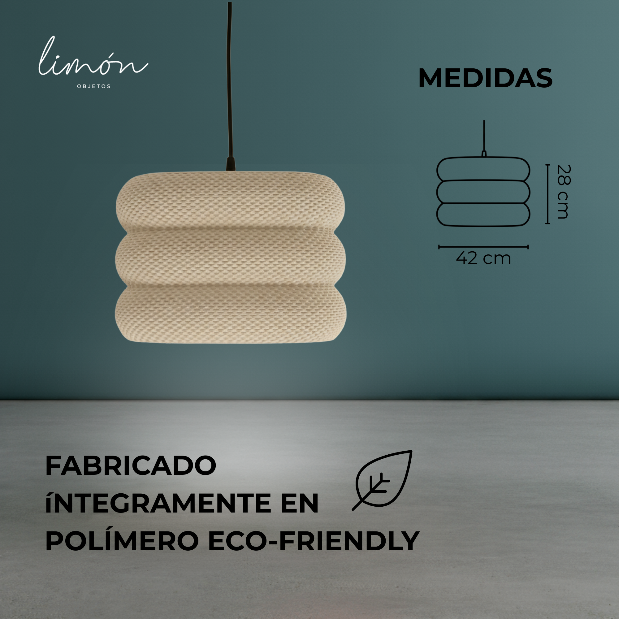 Fabricada íntegramente en polímero eco-friendly, Nubo no solo ilumina, sino que también aporta un toque de diseño responsable y duradero. Su textura tejida y acabado natural la convierten en una protagonista silenciosa: elegante, versátil y sustentable.
